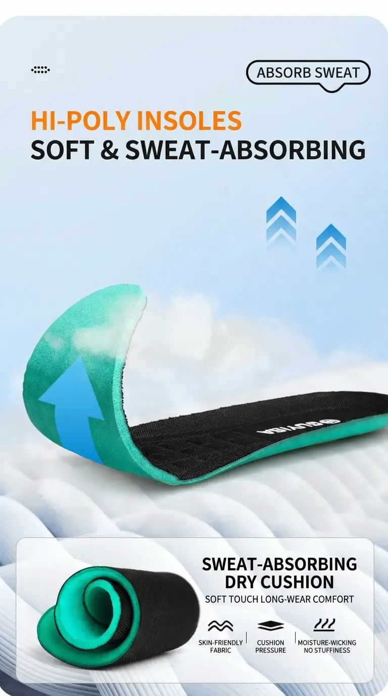 Insole: Ergonomic shock-absorbing and moisture-wicking insole made of HYPUR (high-performance polyurethane) material;